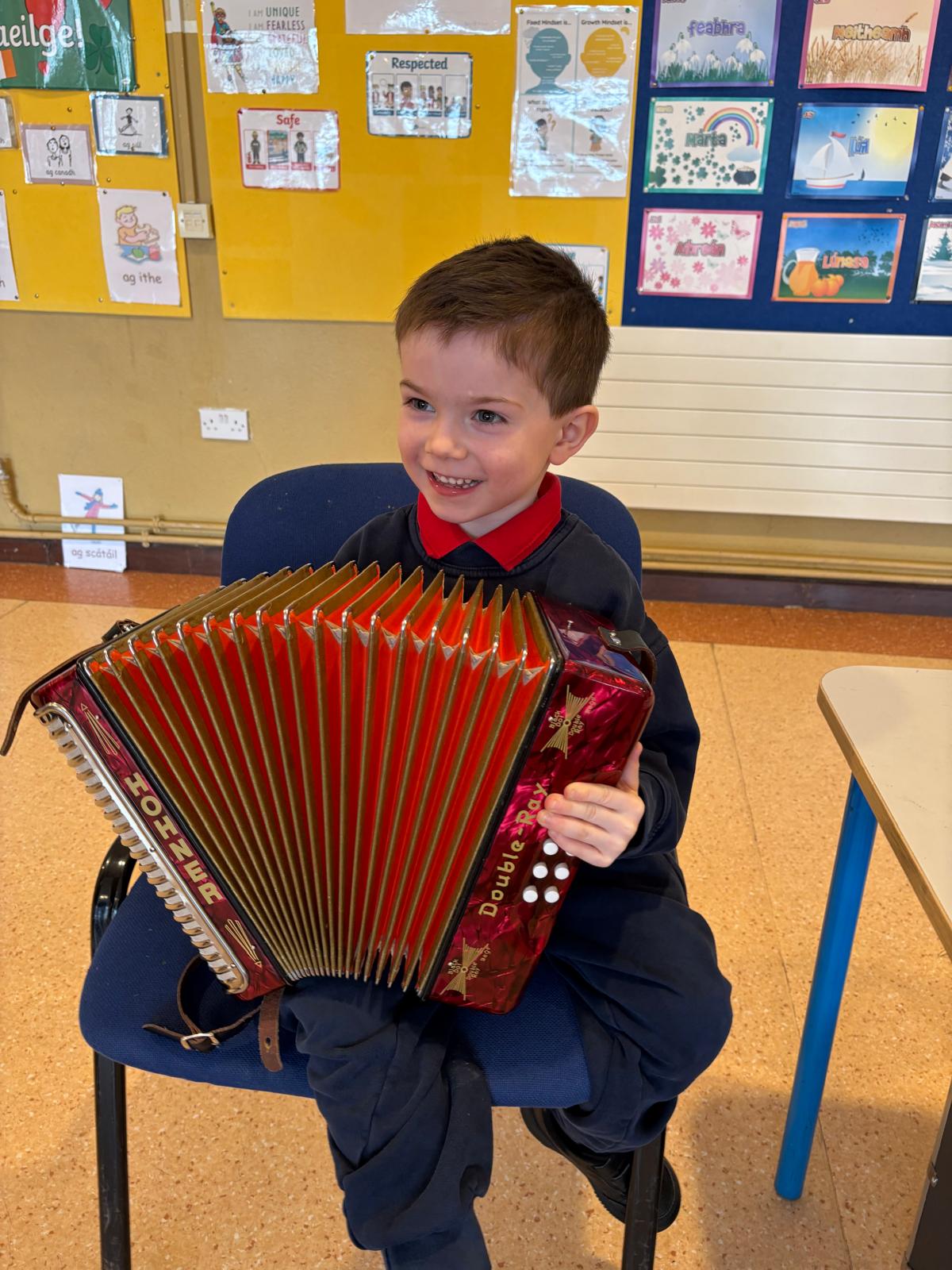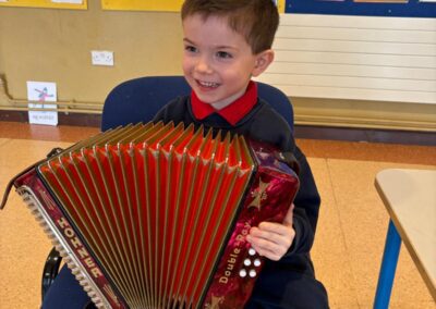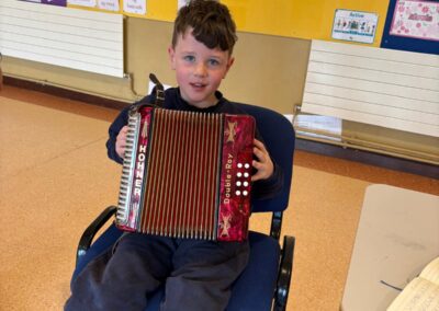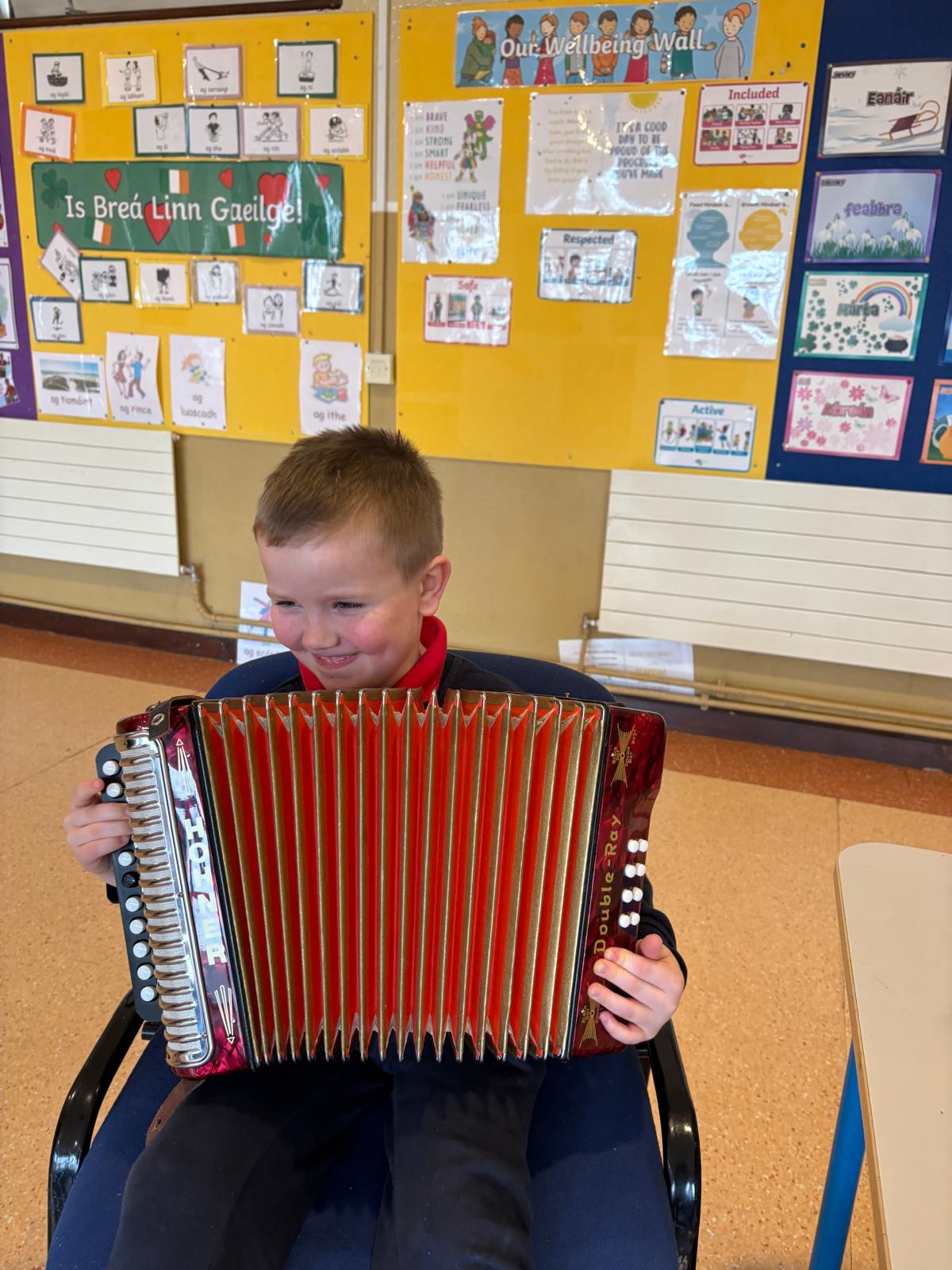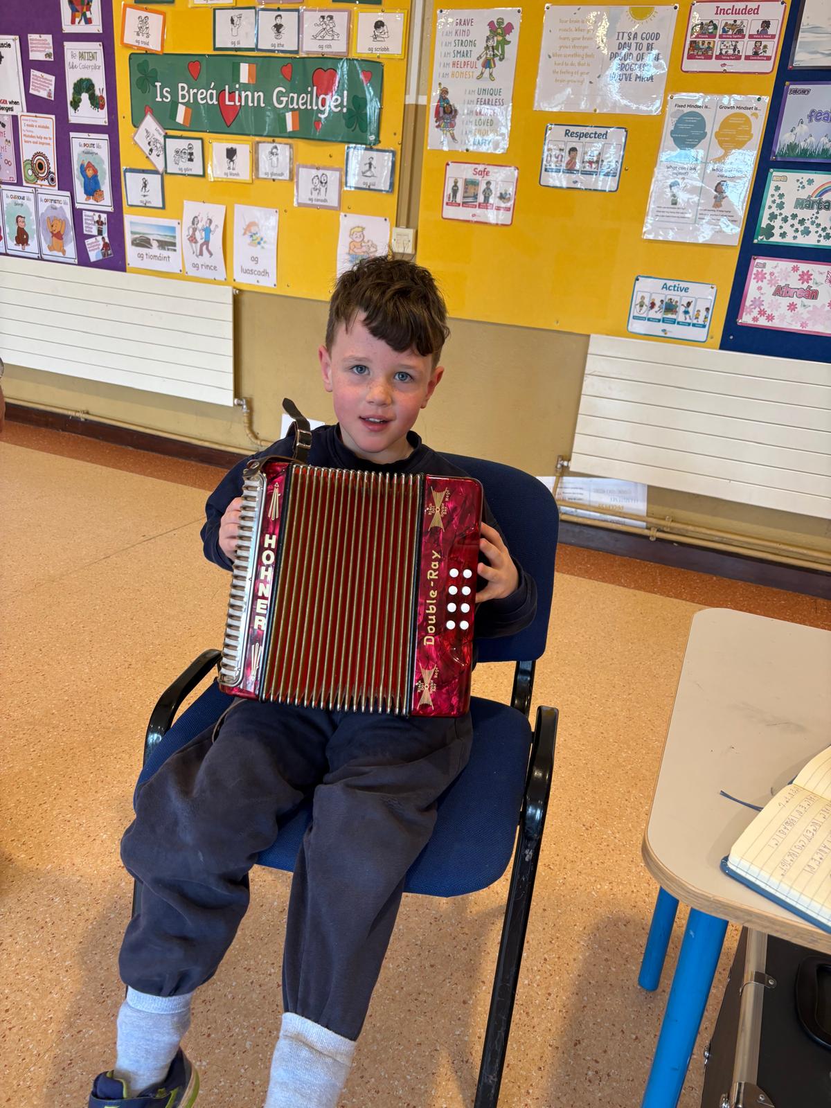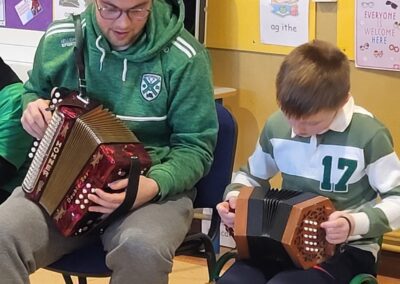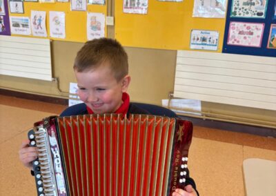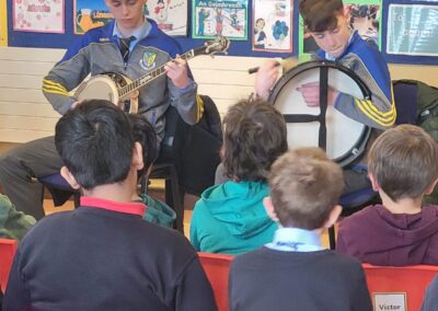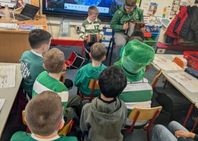 Throughout the week, the children learned about the various Irish musical instruments, played their tin whistles and had the opportunity to play the bodhrán! Ceolchoirm le Colman agus Máire- We were delighted to welcome the talented, Mr Colman Nugent, a previous teacher in St.Corban’s, along with Máire to perform some wonderful Irish traditional music in our halla. They played some Irish traditional instruments such as the tin whistle, banjo, guitar, Irish flute, mandolin and fiddle. The talented Mr. Dineen also performed on the accordian and some of the boys from Naas CBS were also invited to perform.