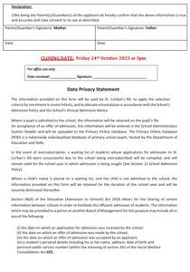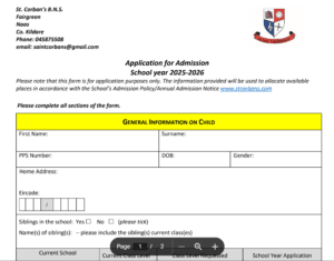 We can only accept Application for Admission forms from October 6th to October 24th 2025 on the school website below. You may request a form at saintcorbans@gmail.com and we can email you a form. You can collect an Application Form from the Main Office in the school. Applications outside of this period will be treated as late applications.